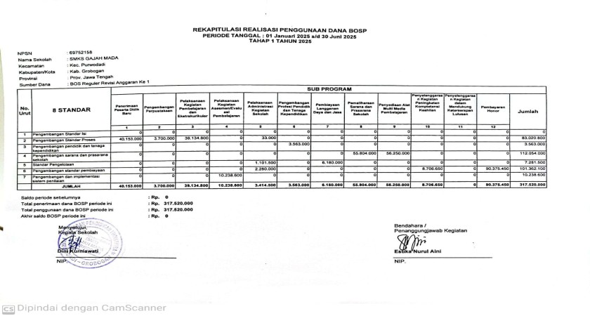 Dana tersebut telah digunakan sesuai dengan ketentuan dalam Petunjuk Teknis (Juknis) Pengelolaan Dana BOSP Tahun 2025, dengan mengedepankan prinsip **transparansi, akuntabilitas, efisiensi, dan efektivitas**. Seluruh kegiatan yang dibiayai bersifat mendukung proses pembelajaran dan pelayanan pendidikan yang berkualitas di lingkungan SMK Gajah Mada Purwodadi.